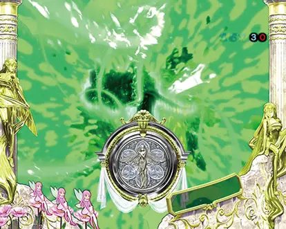 画面上部の役物作動と連動してエフェクトが発生。エフェクト色は、ステップアップでより高信頼度のパターンに変化することも!?