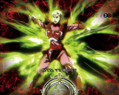 ビルバインと敵オーラバトラーによる大迫力バトルで当否を告知する。