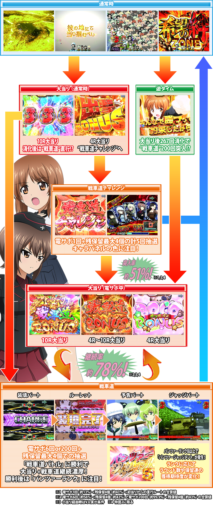 Pガールズ&パンツァー 劇場版 甘デジ|ゲームフロー・通常時・遊タイム・大当り・右打ち