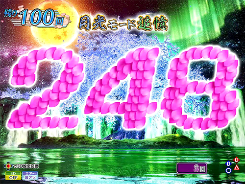 「満月の刻」にて時短図柄獲得成功後に突入する電サポ100回の時短状態。
