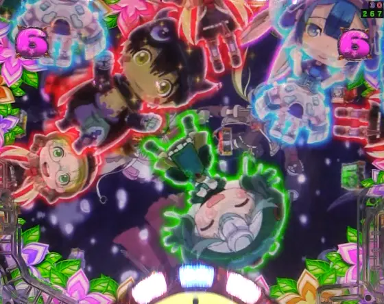 テンパイ図柄は下記の形で ステージに対応している ・大穴の街 オース:「6」ジルオ ・深界二層:「2」マルルク ・深界四層:「1」ナナチ ・深界五層:「5」プルシュカ ・星の記憶:上記の4図柄がランダムで発生 |