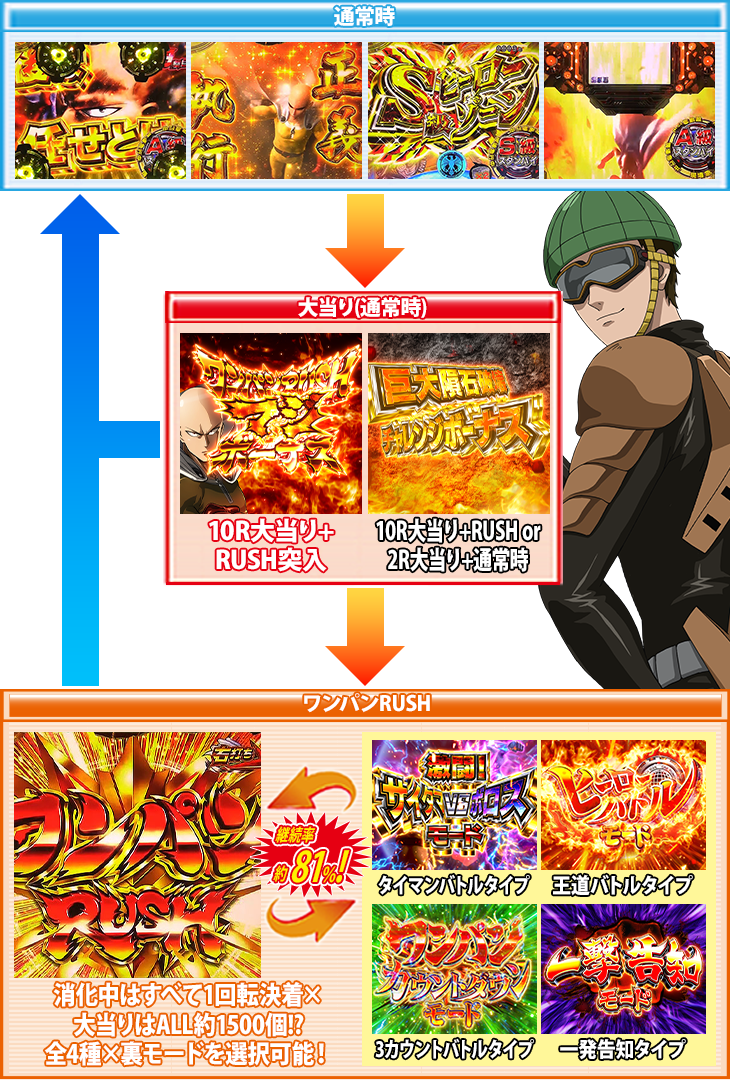 Pワンパンマン - ゲームフロー・通常時・RUSH・右打ち・時短