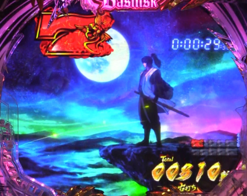 発生時点で10R大当り濃厚となり、「真瞳術RUSH」突入期待度は約70%となっている。弦之介が開眼すれば10R大当り+「真瞳術RUSH」突入濃厚だ!