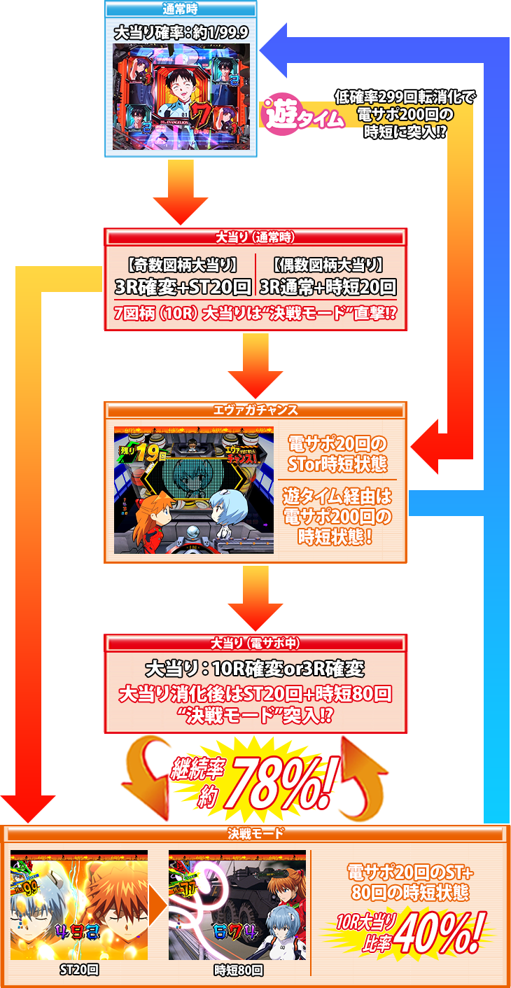 新世紀エヴァンゲリオン 決戦 プレミアムモデル|ゲームフロー 通常時 大当り 確変 ST RUSH 右打ち 時短 電サポ中 直行 突入 移行先