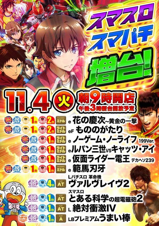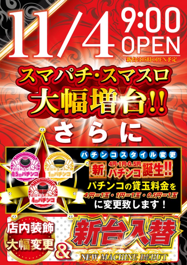 - 1000円/1,840玉パチ:44台1000円/920玉パチ:88台 1000円/230玉パチ:88台 1000円/460枚スロ:30台 1000円/184枚スロ:15台 1000円/46枚スロ:103台