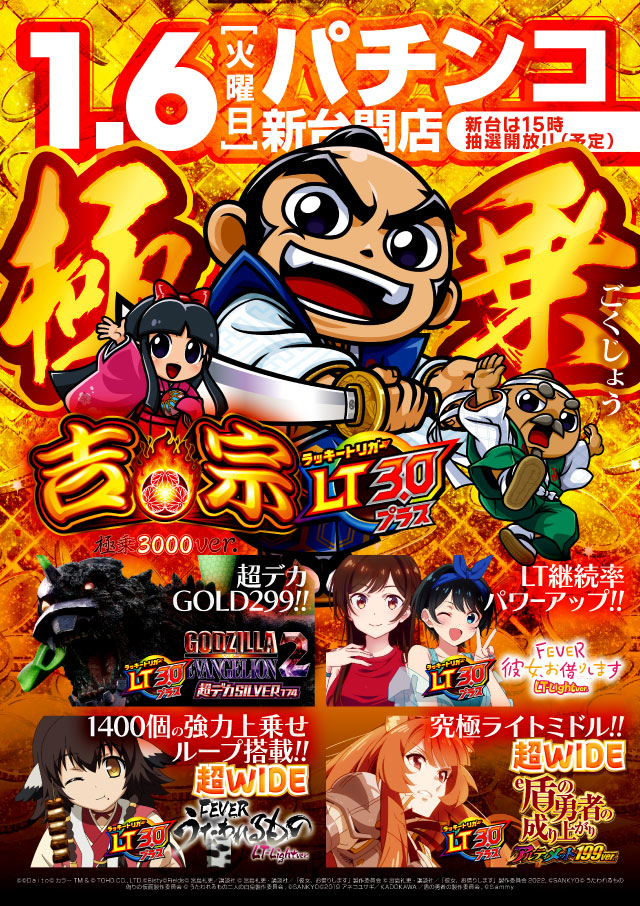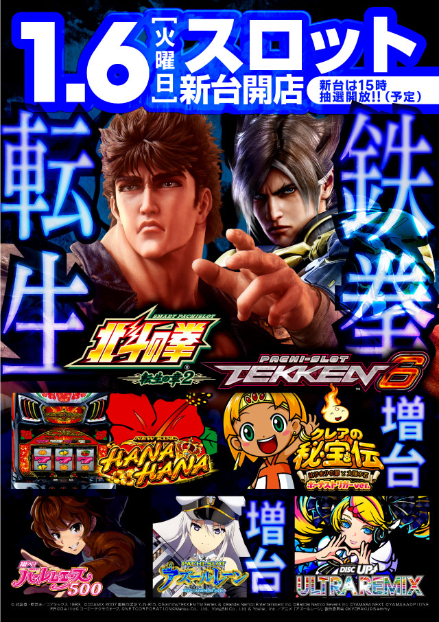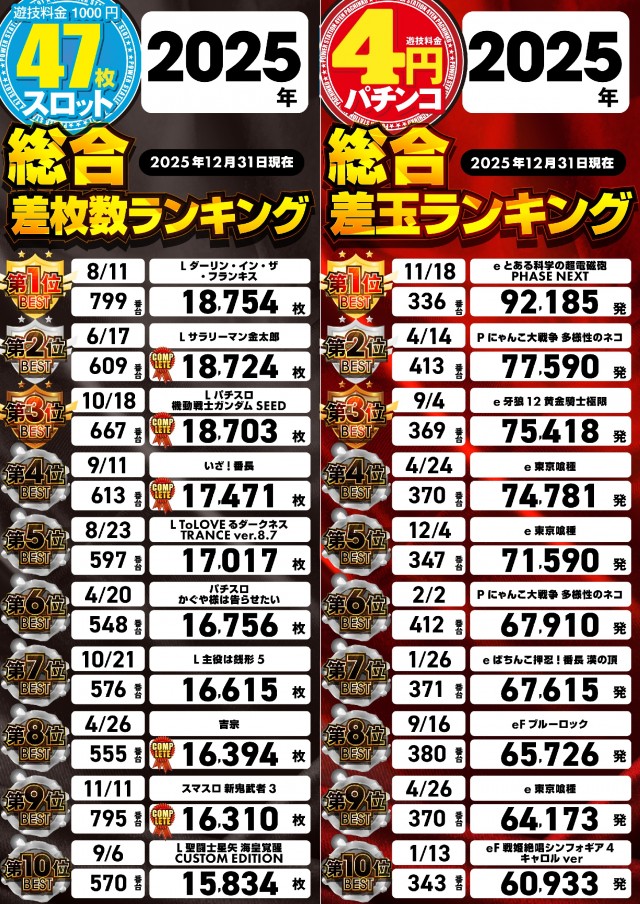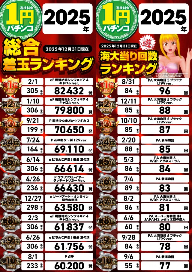 - [1]パチ:252台 [0.4]パチ:36台 [4]パチ:252台 [1000円/47枚]スロ:336台 [6.25]スロ:96台 [2]スロ:33台