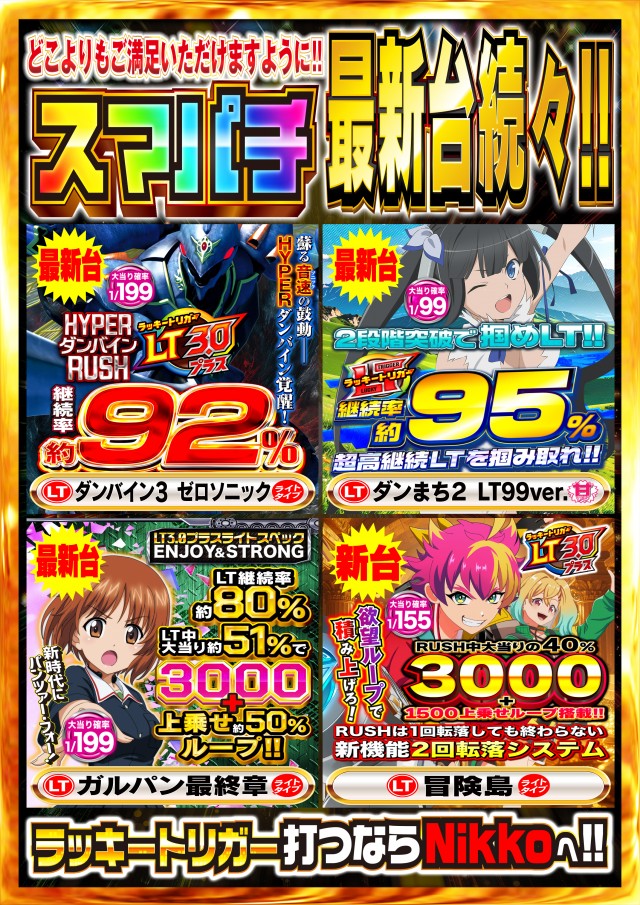 - 最新各台計数機導入店! パチンココ-ナ-全台に USB差込口、 ドリンクホルダ-、 肘置きを設備し、 快適な遊技環境を実現! ぜひ nikko town本店に お越しください★ 皆様のご来店を心より お待ちしております♪