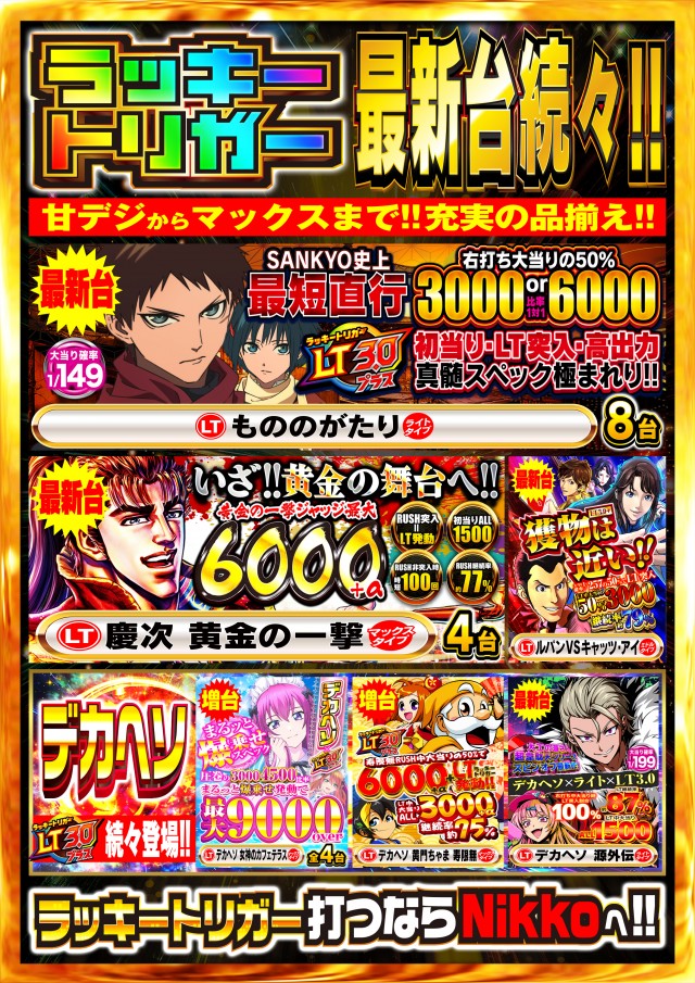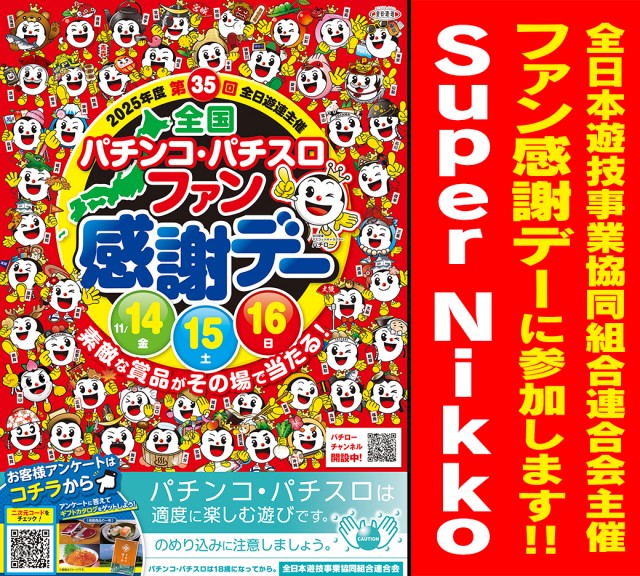 - 優雅で快適 ゆったり遊技空間 ★選べる遊べるラインナップ ★日本初!脱臭ルーム「真無臭」 ★超高速Wi-Fi等の設備 ★選べる3つのリラックススペース ★広くゆったりとした喫煙ルームを完備 ぜひ Super nikkoにお越しください 皆様のご来店を心より お待ちしております♪