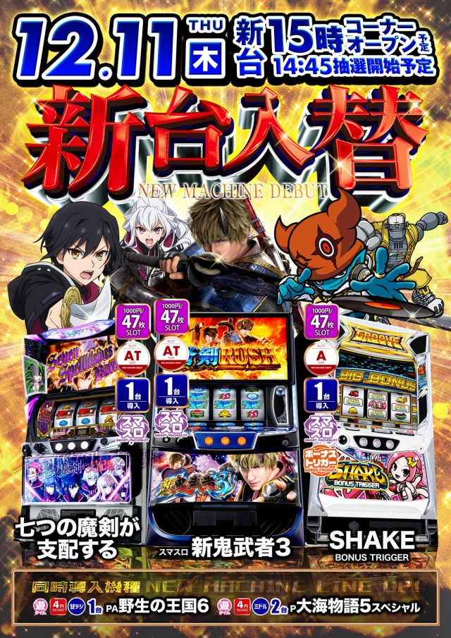 - パチンコ: [4]:120台 [500円/462玉]:40台 パチスロ: [1000円/47枚]:109台 [500円/92枚]:35台
