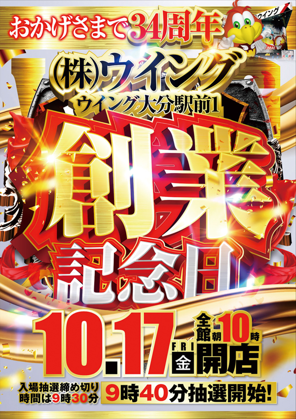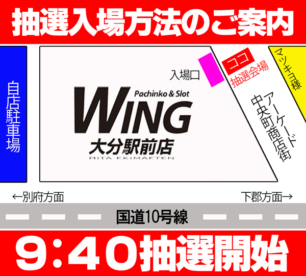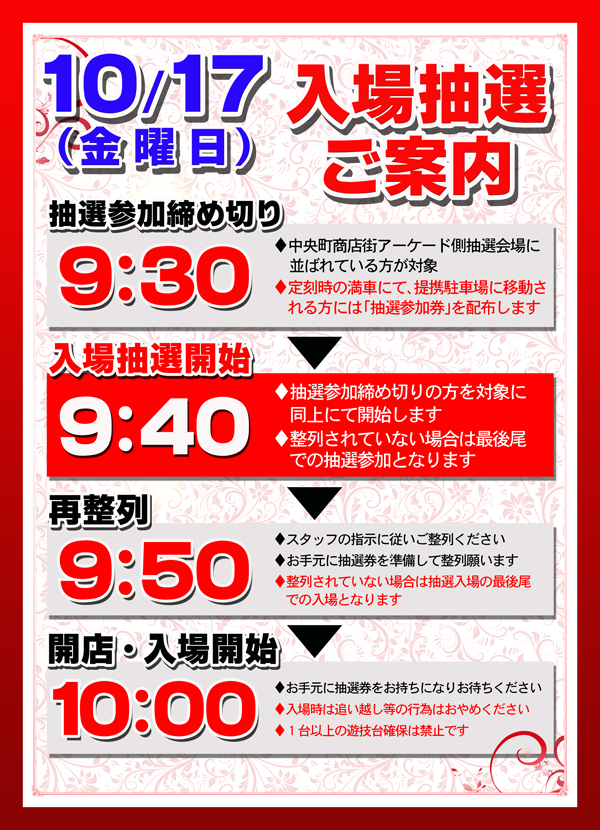 - 入場抽選★9:40までに「中央町商店街アーケード内入口」に並ばれたお客様を対象に開始いたします。