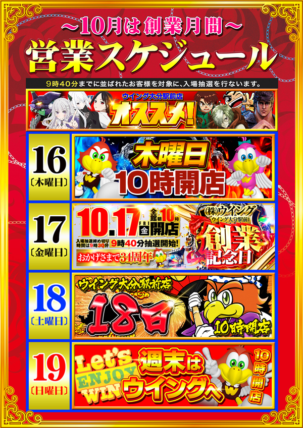 - 9月店休日:1階『9日』2階『16日』※翌日が新台入替となります。