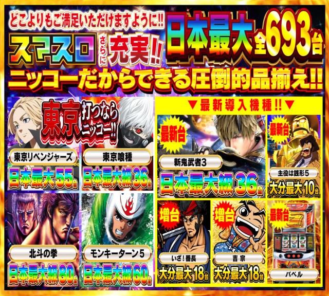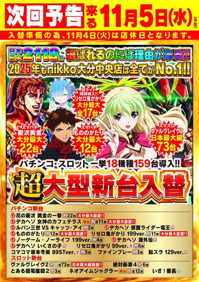 - nikko 大分中央店は遊技台数2118台を誇る 日本最大級の娯楽施設として大分市で営業致しております。 お客様とお逢いできることをスタッフ一同 大変嬉しくこころより感謝致しております。 優雅かつ雅な娯楽施設で 今まで体感したことのない贅沢なひとときを、ご堪能下さい。 今後とも末永くご愛顧賜りますよう宜しくお願い申し上げます。