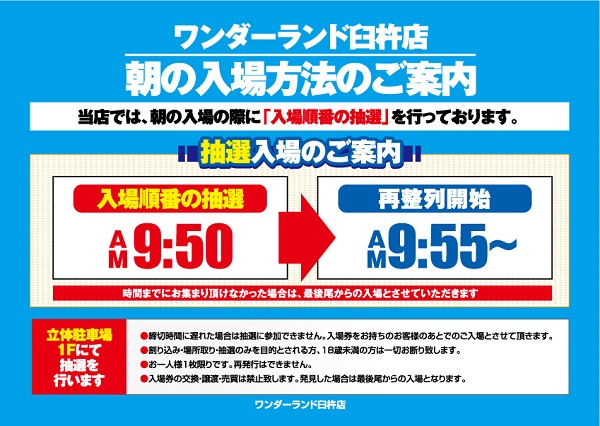 - 9時50分迄にお並び頂いた方で入場順を抽選します。再整列お時間は9時55分です。