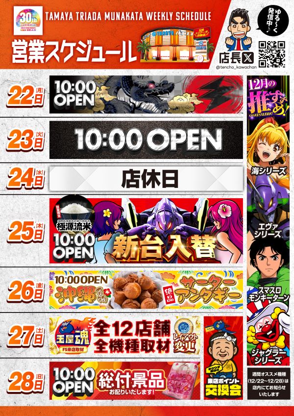 - 不定休 ※新台入替準備のため前日がお休みとなります。