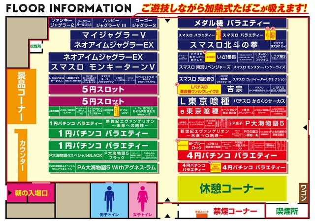 - 【パチ】1000円/250玉:120台 1000円/1000玉:120台 計240台 【スロ】1000円/46枚:275台 1000円/180枚:40台 計315台