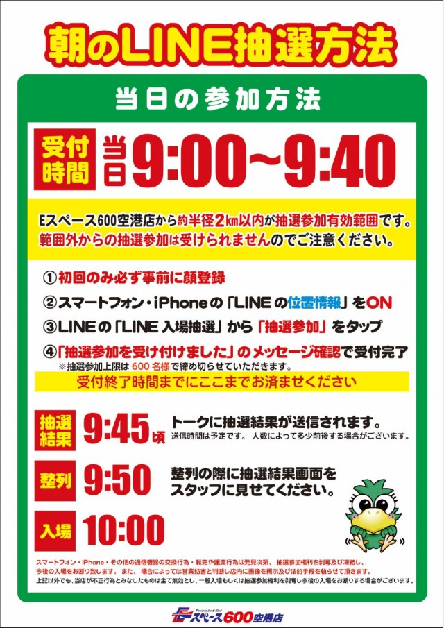 - LINE抽選です。 受付【9:00~9:40】 抽選結果【9:45頃】 整列【9:50】