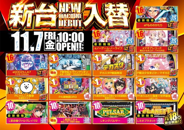 - [1]パチ:216台 [0.5]パチ:36台 [1.6]パチ:36台 [2.778]スロ:36台 [1000円/90枚]スロ:144台 [1000円/46枚]スロ:36台
