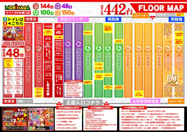 - [パチ] 200円/181玉:150台 4円:100台 計250台 [スロ] 1000円/47枚:144台 1,000円/181枚:48台 計192台