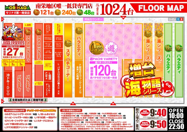- 低貸専門店 総台数409台 [パチ] 1円 240台 0.5円 48台 [スロ] 1000円/181枚 121台