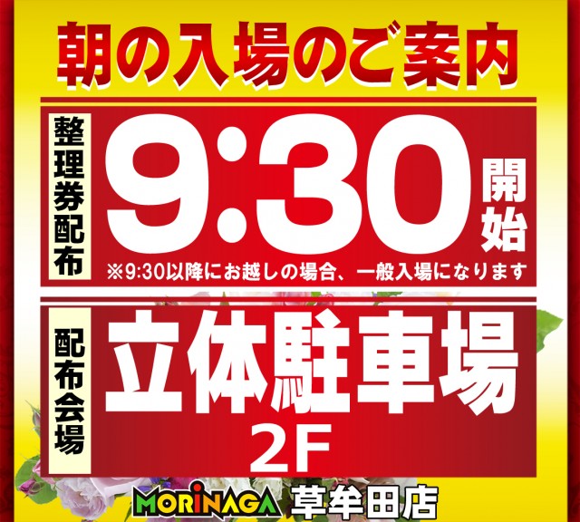 - AM9:30までにお集まりのお客様を対象に、入場整理券の配布を行います。※朝の入場は先着順(並んだ順)ではありません。