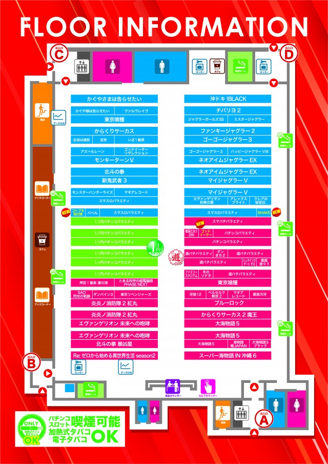 - ■テレビが見れる『プレジャービジョン』全台完備♪ ■空気を水洗い☆『ミストアタック』設置♪ ■遊技しながら携帯の充電ができる『USB端末』全台完備♪ ■パチンコ全台に『分煙ボード』完備♪