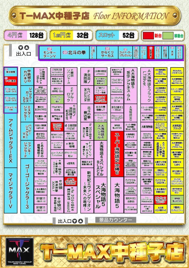 - [100円/25玉]パチ:128台 [100円/80玉]パチ:32台 [1000円/50枚]スロ:52台