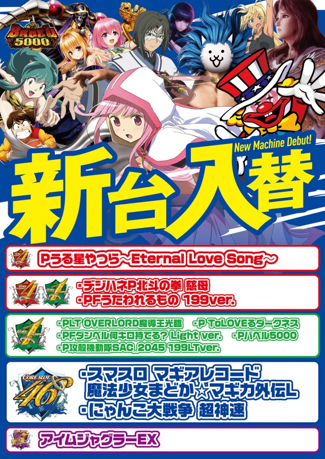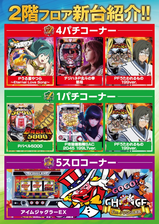 - パチンコ [4]パチ:152台 [100円/90玉]パチ:249台 [0.556]パチ:40台 スロット [1000円/46枚]スロ:156台 [1000円/180枚]スロ:67台