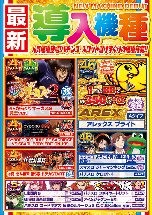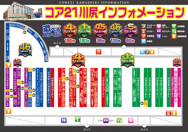 - 4パチ:180台 1パチ:180台 0.5パチ:36台 1000円46枚スロ:110台 1000円180枚スロ:80台