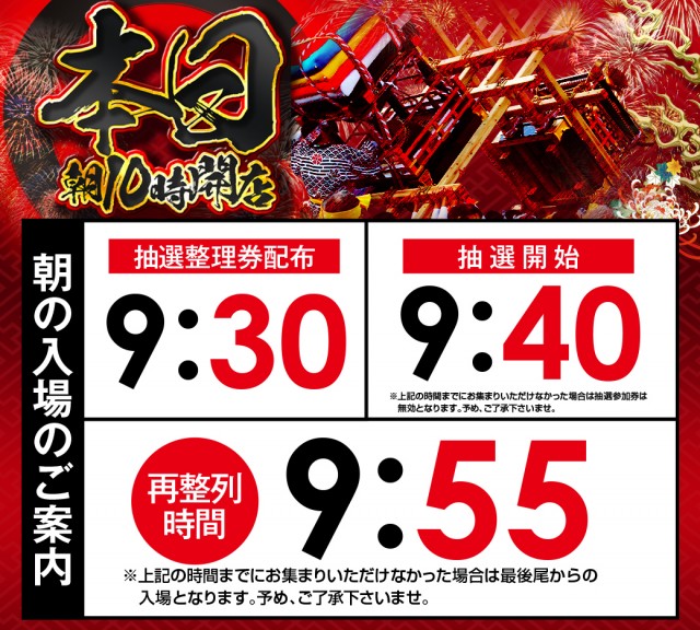 - 朝9時30分より抽選参加券を配布、9時40分に入場順番を決める抽選を開始します。再整列時間は9時55分です。