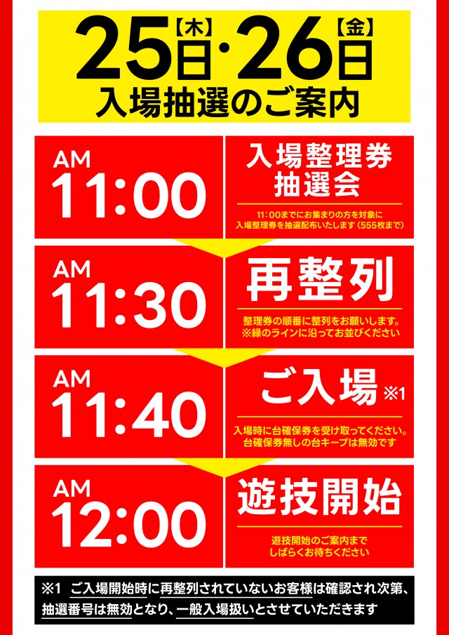 - 朝9時40分に駐車場スロープで抽選会を行います。(混雑が予想される場合は変更する可能性あり)10時から抽選番号順に入場開始です。