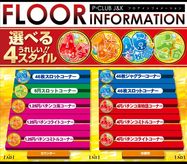 - [4]パチ:120台 [1.25]パチ:120台 [1000円/46枚]スロ:120台 [5]スロ:40台