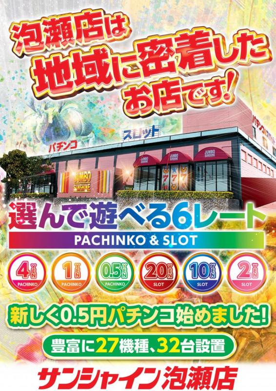 - 泡瀬エリアで遊べる⑤レート!情熱営業中! パチンコ1玉 4円貸/32台 パチンコ1玉1.12円貸/32台 パチンコ1玉0.56円貸/32台 メダル1枚21.74貸/196台 メダル1枚11.24貸/28台 メダル1枚2.248円貸/28台