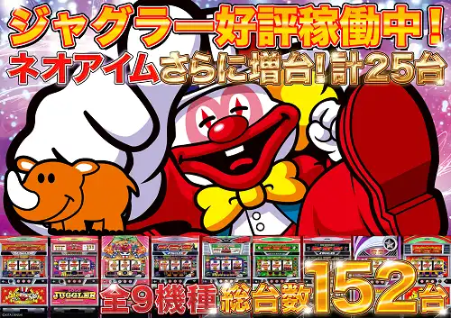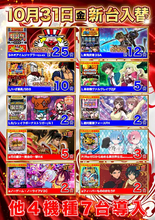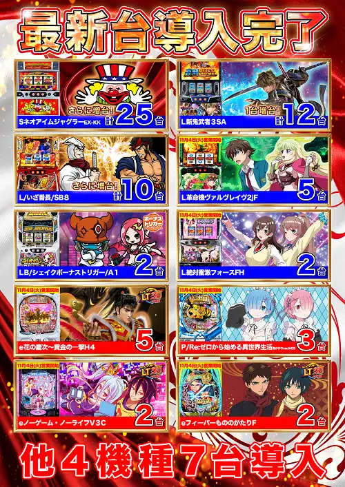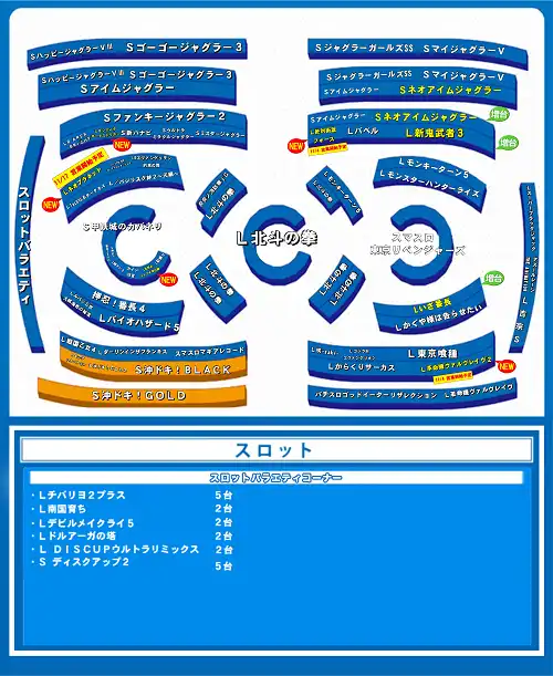 - パチンコ1000円/245玉 480台 ライトパチンコ500円/490玉 240台 スロット1000円/49枚 480台