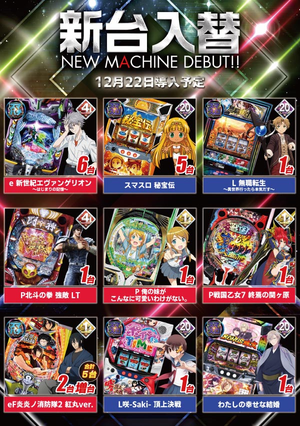 - [4]パチ:200台 [0.222]パチ:40台 [1]パチ:242台 [1000円/46枚]スロ:352台 [1000円/184枚]スロ:88台