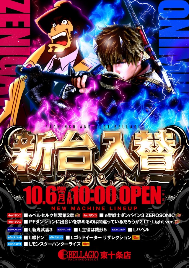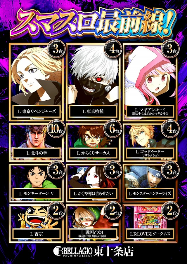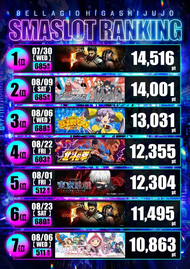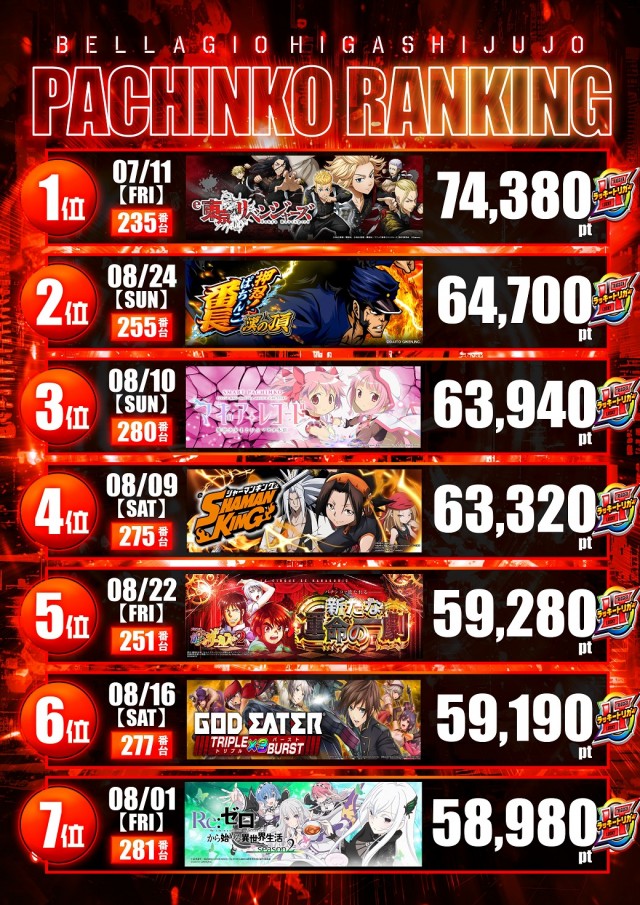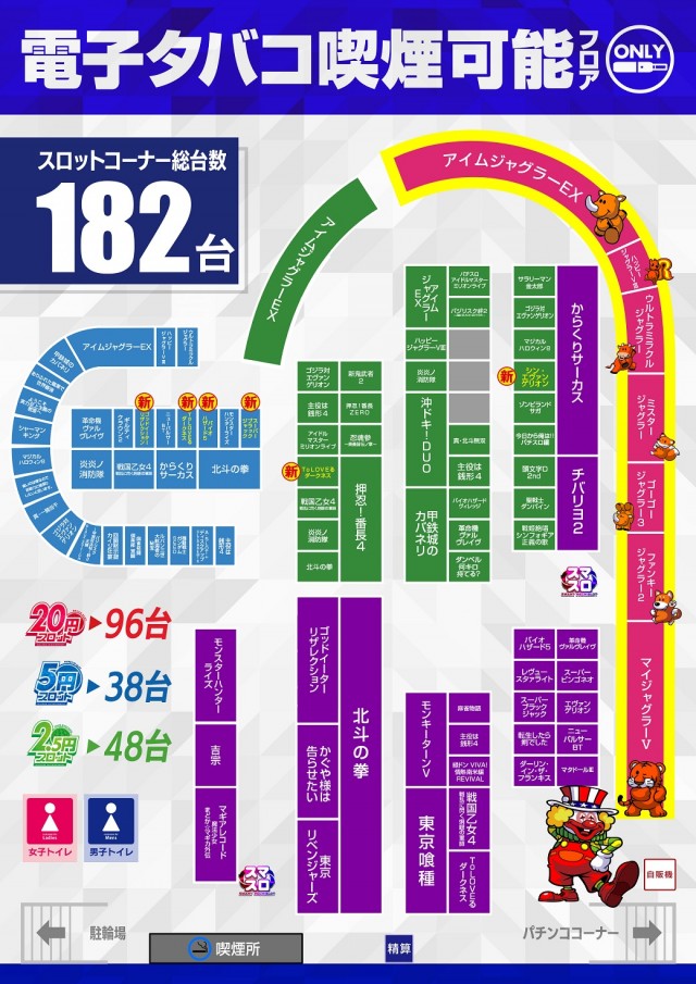 - [4]パチ:56台 [0.5]パチ:36台 [1]パチ:114台 [1000円/46枚]スロ:96台 [1000円/184枚]スロ:38台 [1000円/368枚]スロ:48台