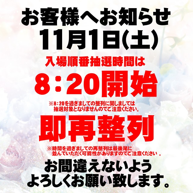 - 当店は入場順番抽選方式です。 抽選開始8:30 再整列8:55 ※不定期で抽選時間が変更になる事もございます。 その際は最新情報にてご案内致します。