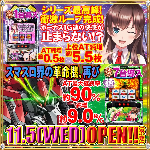 - [4]パチ:160台 [1]パチ:122台 [0.2]パチ:32台 [5]スロ:44台 [2]スロ:53台 [1000円/46枚]スロ:255台