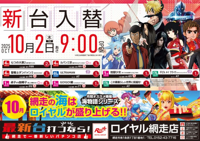 - ロイヤル網走店DMMぱちタウンをご覧いただきありがとうございます。 ロイヤル網走店スタッフ一同は地域の皆様に愛される、過ごしやすい快適な空間を目指します。