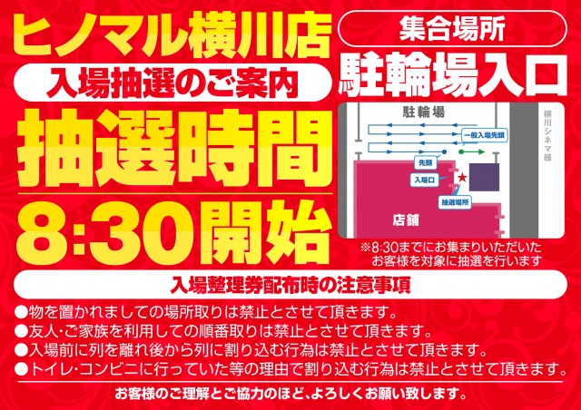 - AM8:45までに、店舗駐輪場にお並びのお客様対象に入場整理券の抽選を行います。混雑日は、予告無しに時間変更する場合がございます。