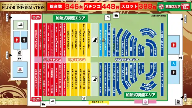 - 4パチ:256台 1パチ:192台 1000円/46枚スロ:358台 1000円/184枚スロ:40台