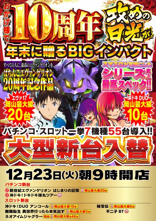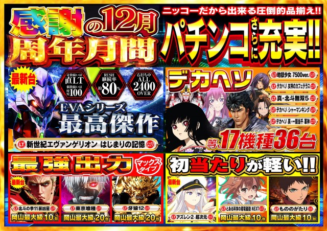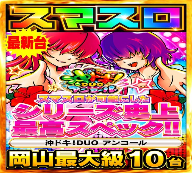 - ■AQC-2000Ⅱ導入で 店内快適空間を実現! ■ハイブリッドシステム(貯玉乗り入れシステム)導入! ■超高速Wi-Fi完備! ■全台分煙ボード完備&USB充電ポート搭載! ■全台 BIGMOプレミアム導入! ■全台各台計数機設置(1枚・1玉単位で管理出来ます) ■新サービス『脱臭ルーム』消臭&除菌でスッキリ!! ■岡山最高級のレストルームを新設!!