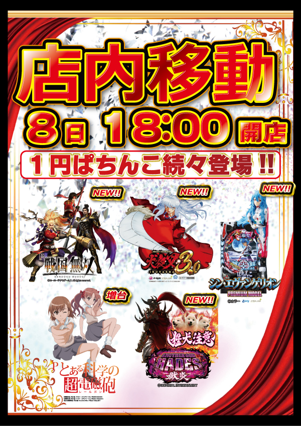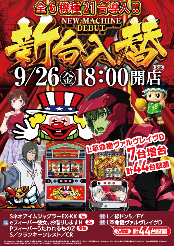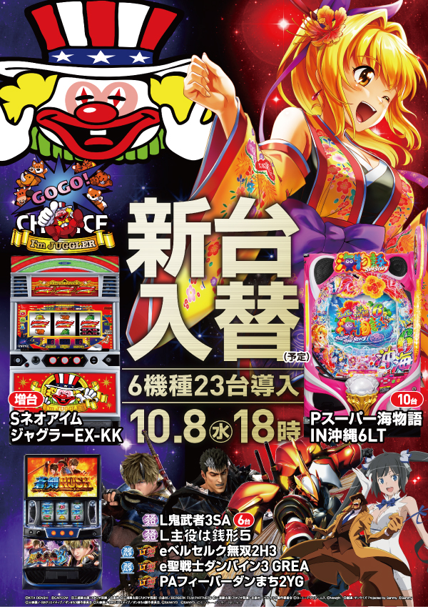 - [4]パチ:255台 [1]パチ:187台 [2.5]スロ:34台 [1000円/46枚]スロ:325台 [10]スロ:10台