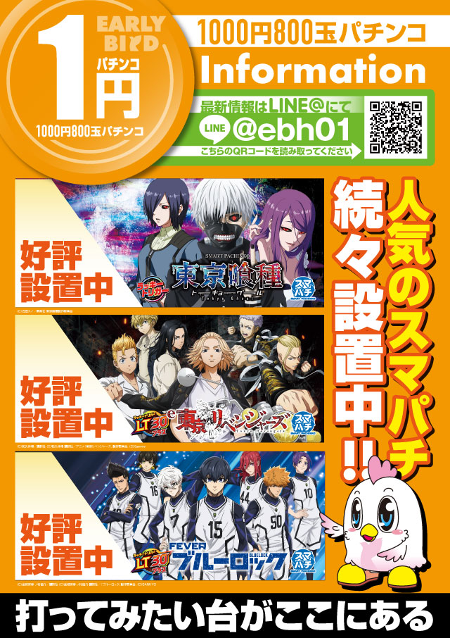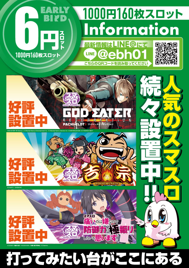 - ■電子タバコ喫煙エリア ・4パチ(1000円250玉) 108台 ・1パチ(1000円800玉) 180台 ・20スロ(1000円46枚) 218台 ・6スロ(1000円160枚) 35台 ■非喫煙エリア ・6スロ(1000円160枚) 1台
