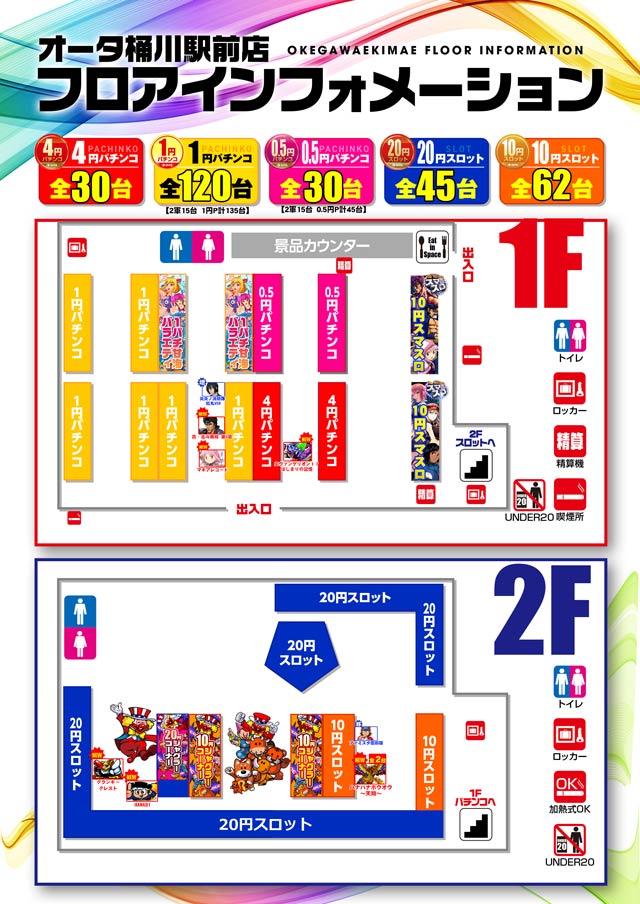 - [パチ] 4円:30台 100円/90玉:135台 0.55円:45台 計210台 [スロ] 20円:45台 10円:62台 計107台