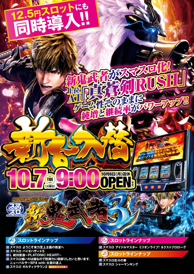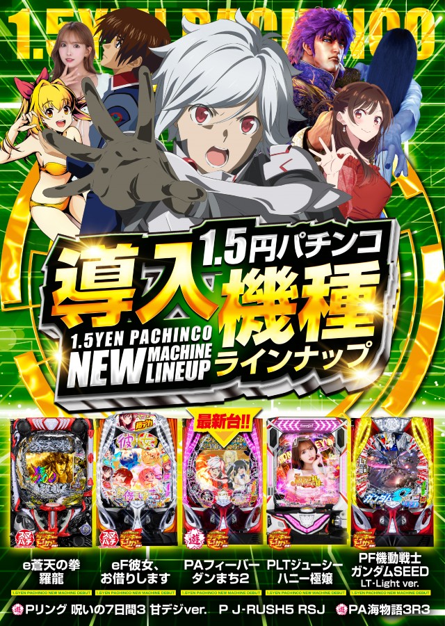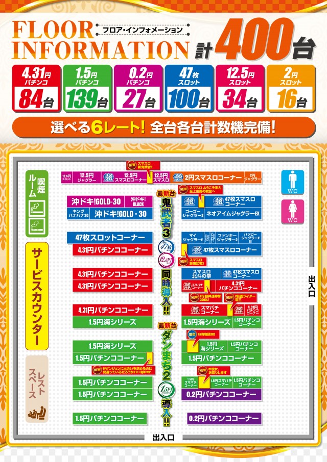 - [500円/116玉]パチ:84台 [0.2]パチ:27台 [1.54]パチ:139台 [12.5]スロ:34台 [2]スロ:16台 [1000円/47枚]スロ:100台