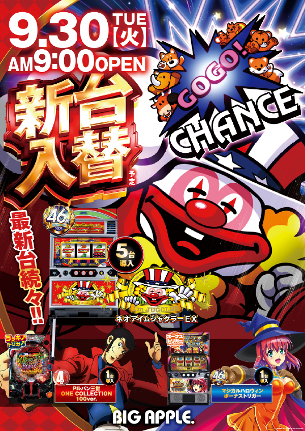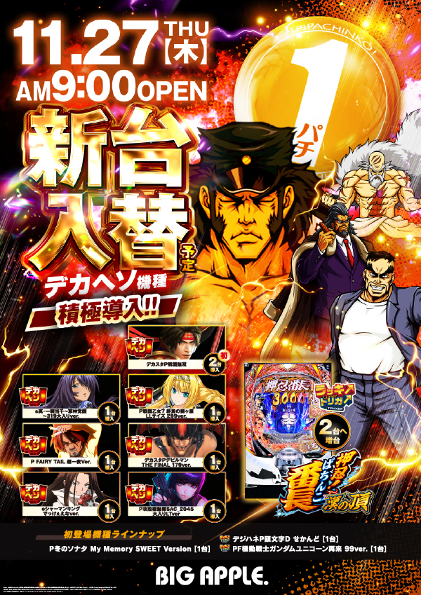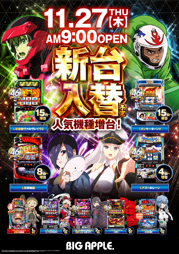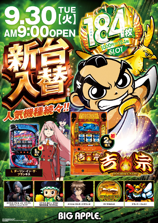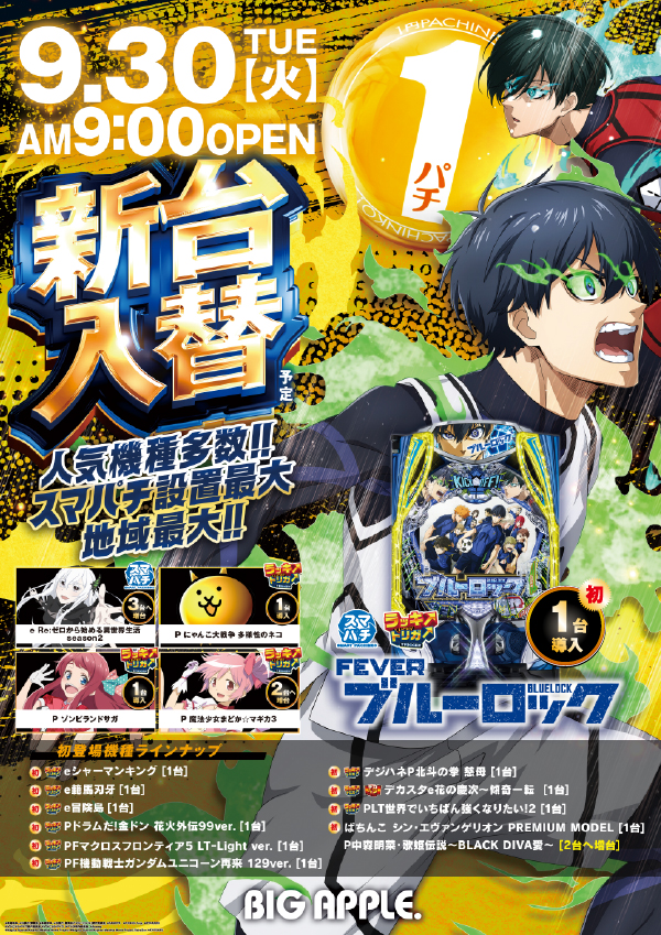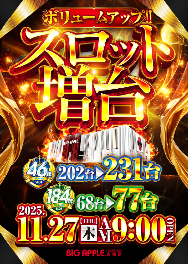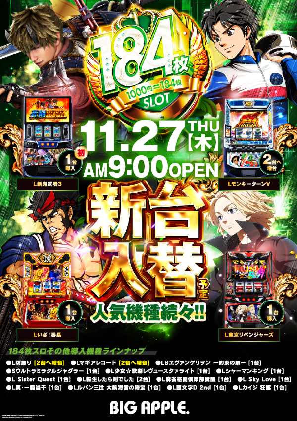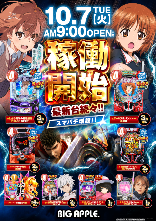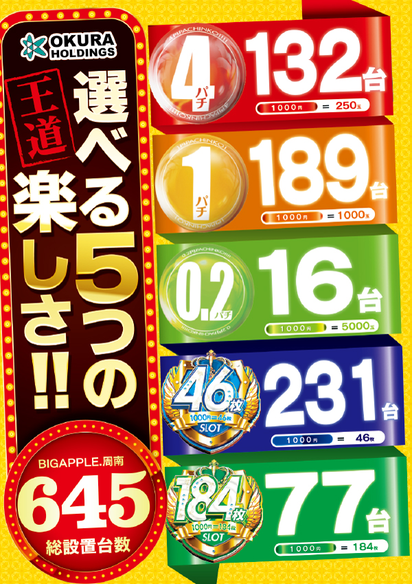 - [4]パチ:128台 [1]パチ:209台 [0.2]パチ:30台 [1,000=46枚]スロ:202台 [1,000=184枚]スロ68台