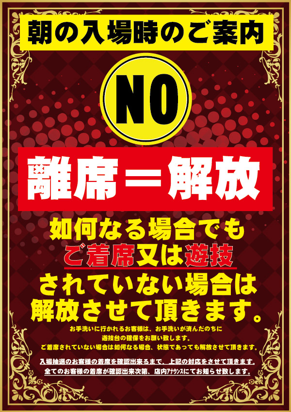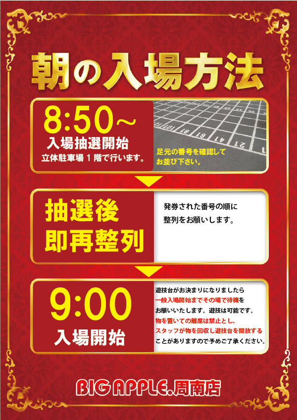 - 立体駐車場側入口にて整理券を配布し8時50分よりランダムに入場順番を決定します。ご参加希望のお客様は8時50分までに立体駐車場側入口までお集まりください。