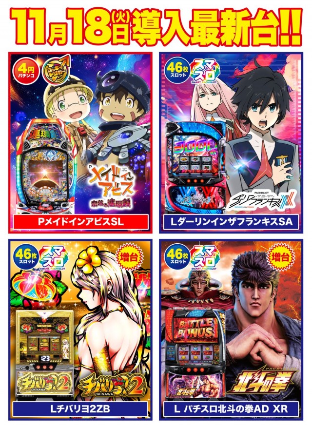 - [4]パチ:130台 [1]パチ:128台 [0.2]パチ:26台 [1000円/46枚]スロ:147台 [1000円/182枚]スロ:24台