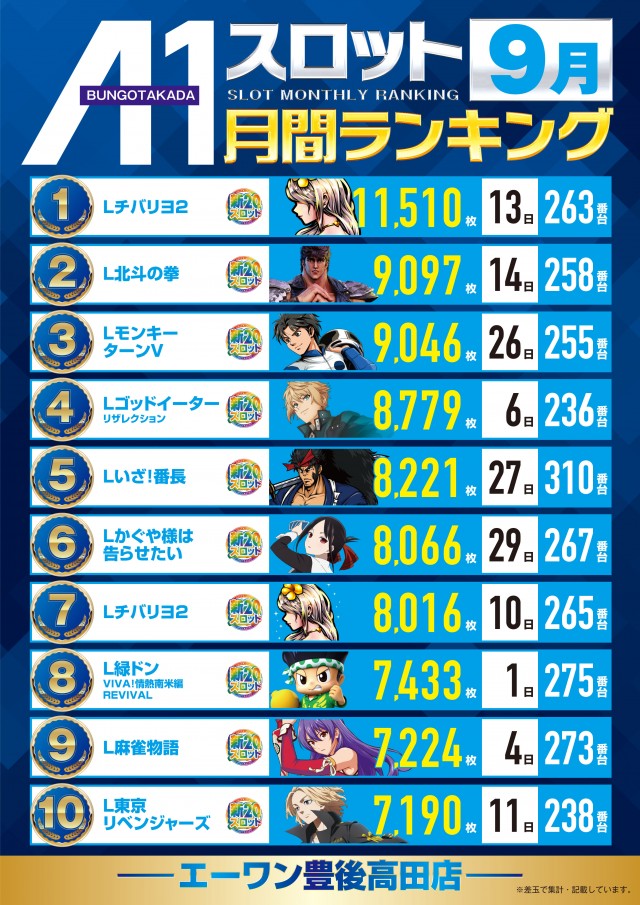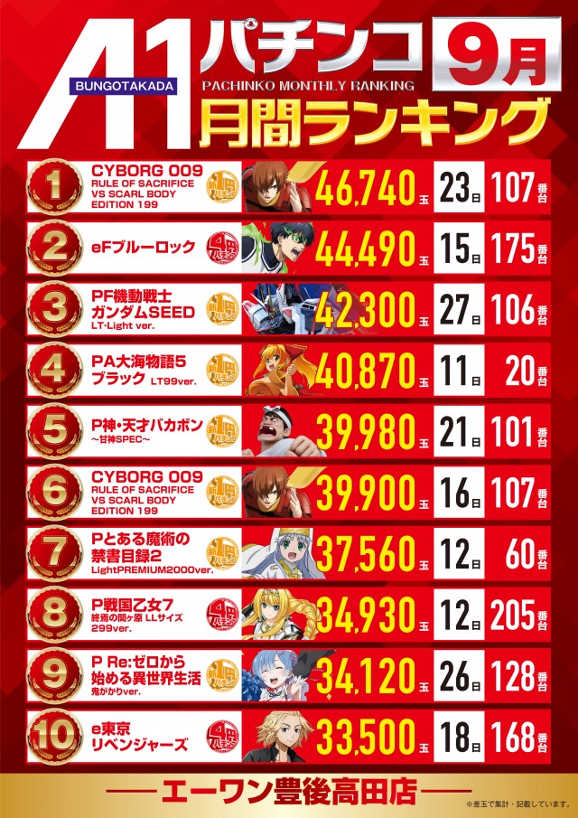- [4]パチ:60台 [1.111]パチ:95台 [1000円/46枚]スロ:97台 [1000円/180枚]スロ:20台