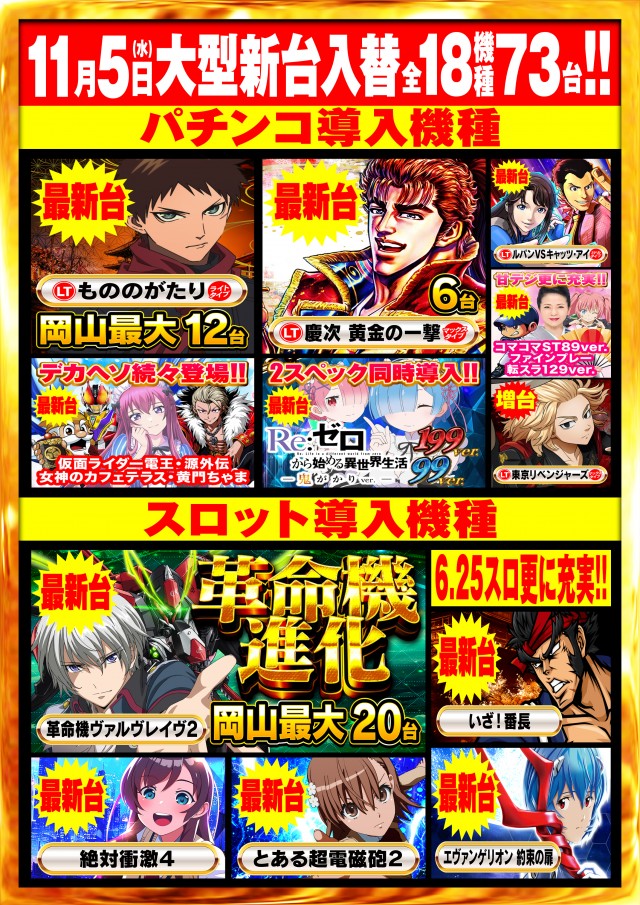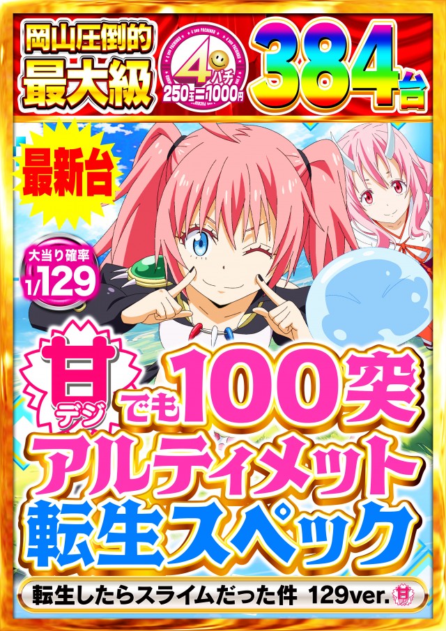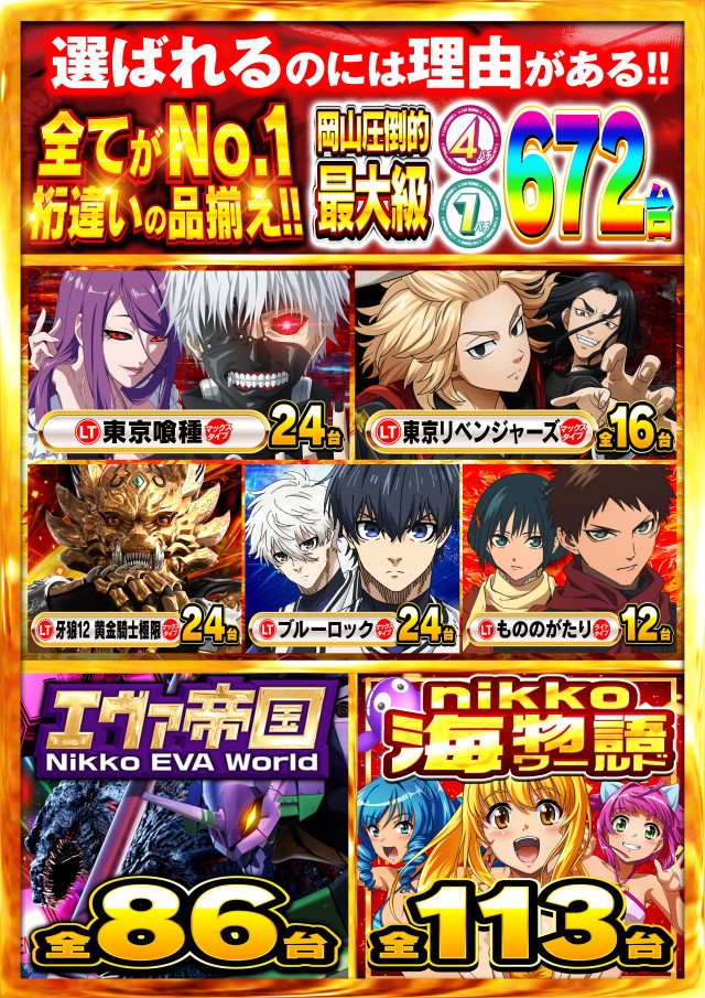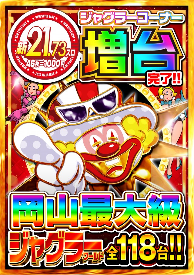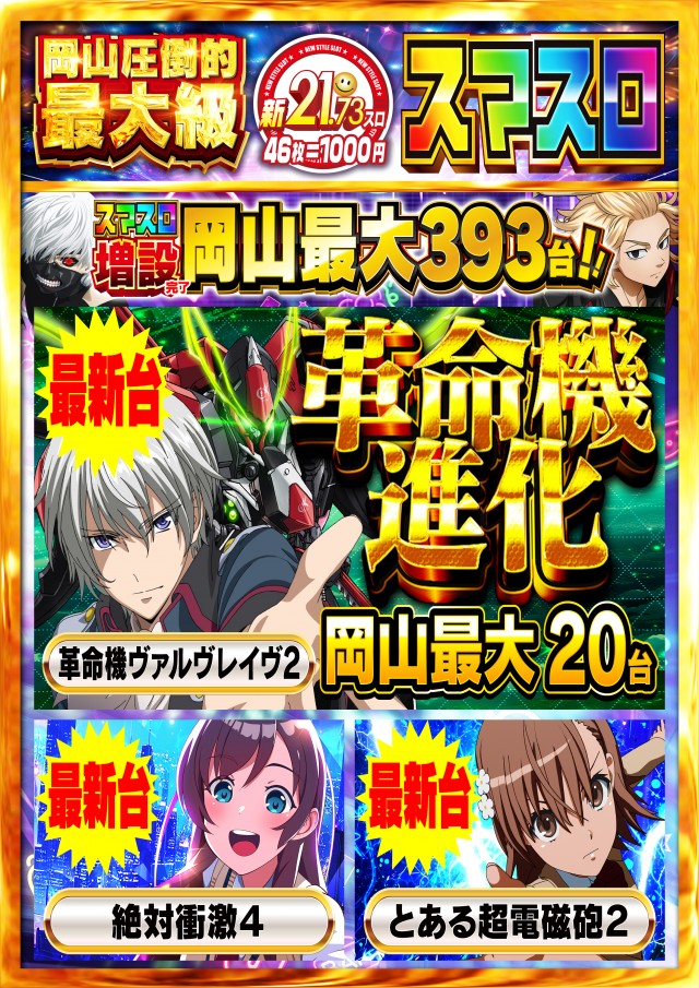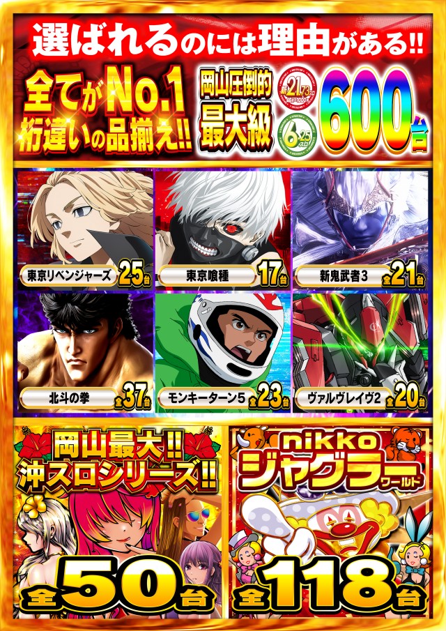 - 4パチ:384台 1パチ:288台 21.73スロ:524台 6.25スロ:76台